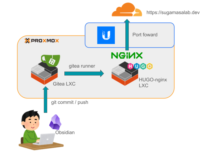 - ローカルの PC に HUGO 作業用のディレクトリを用意して、記事を作成したら LXC 上に展開する gitea のリポジトリに Push → 公開用ウェブサーバーに設置された Nginx のディレクトリに gitea runner (gitea のCI/CD) が自動でデプロイする。